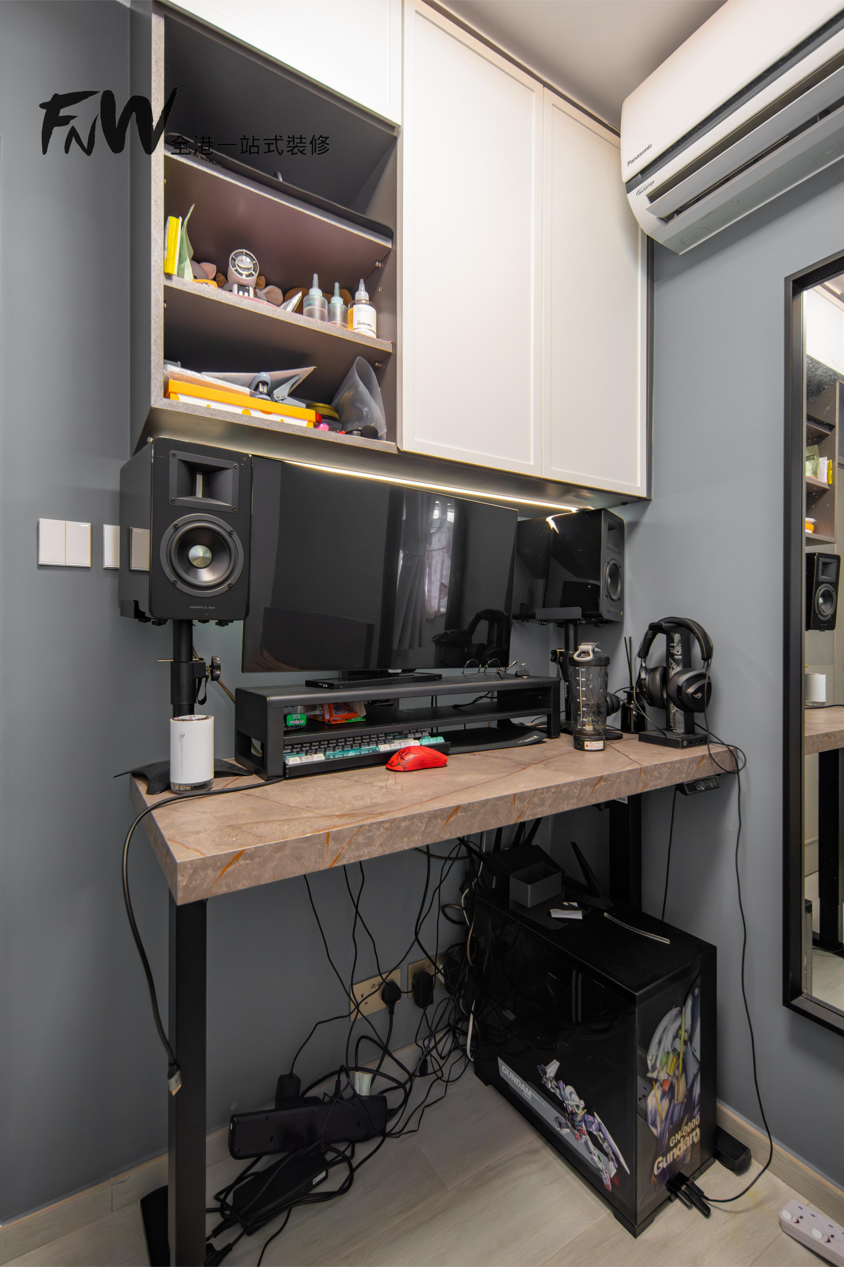 除了更換鋁窗,設計師還量身訂製了一張電動升降書桌。在寸土寸金的香港,如何充分利用空間至關重要。這張書桌不僅可以根據使用者的需求調整高度,更具備收納功能,讓空間得到更有效的利用。